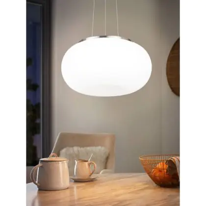 Beschrijving Eglo Pendelarmatuur Optica Staal Satijn Nikkel | Geschikt voor 2x E27