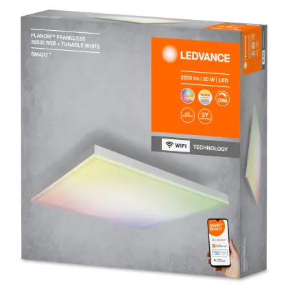 Beschrijving Ledvance LED Paneel Smart+ Planon Zonder frame 20W 1500lm - 830-865 Afstembaar Wit + RGB | 30x30cm - UGR <25 - Wifi Dimbaar