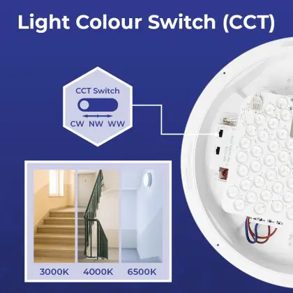 Denk ook goed na over de plaats waar je jouw nieuwe LED plafondverlichting wil ophangen, in combinatie met de juiste kleurtemperatuur. Zo geven 2700 Kelvin (extra warm wit) en 3000 Kelvin (warm wit) wat zachter en aangenamer licht. Deze tint is daarom goed geschikt voor gezellige buitenplaatsen of algemene ruimtes zoals een gang, lift, hal of overloop. 4000 Kelvin (koel wit) oogt qua tint wat feller en frisser en is daarom niet echt geschikt als sfeerverlichting, maar vooral als functionele verlichting. Denk daarbij aan vergaderzalen, gymzalen, werkkamers etc. Deze LED plafondlamp heeft als kleurtemperatuur: 3000K - 4000K - 6000K CCT. Wist je dat het online kopen van LED plafondlampen bij Lampdirect als zakelijke klant extra voordelen met zich meebrengt? Lees er hier alles over.
