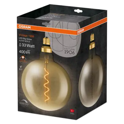 Beschrijving Osram Vintage 1906 LED E27 Globe Filament Gold 200mm 4.8W 400lm - 822 Extra Warm White | Dimmable